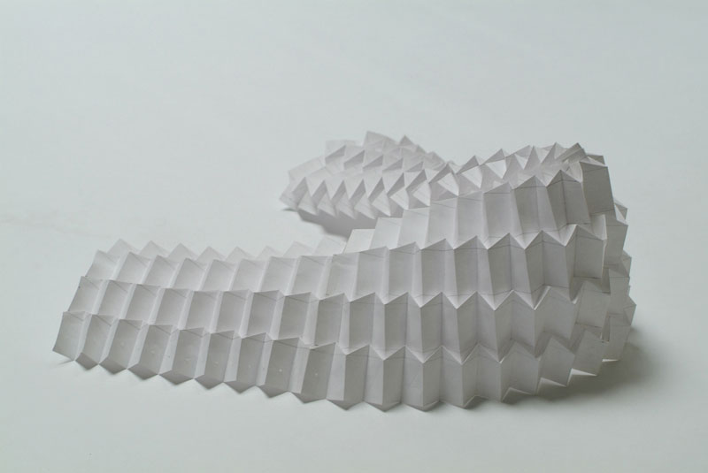 Este tipo de trabajo plantea una modalidad que me ha interesado aplicar: desarrollar una idea a través de distintas escalas, abordando su respectivo grado de complejidad. A escala mayor, aparecen nuevos elementos.“Packaged”, Shopping Centre, Maidstone, Kent – UK (2008, diseño y fotografía: Miwa Takabayashi), trae el pliegue rítmico que emula los soportes repetitivos de las estructuras. Llama la atención que, conteniendo el cuerpo humano, aún se presenta con simplicidad.
