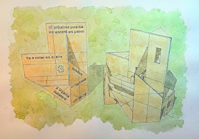 Arriba: acuarela propia de estudio sobre propuesta (prototipo N°3). “El próximo poema / No estará en papel”.